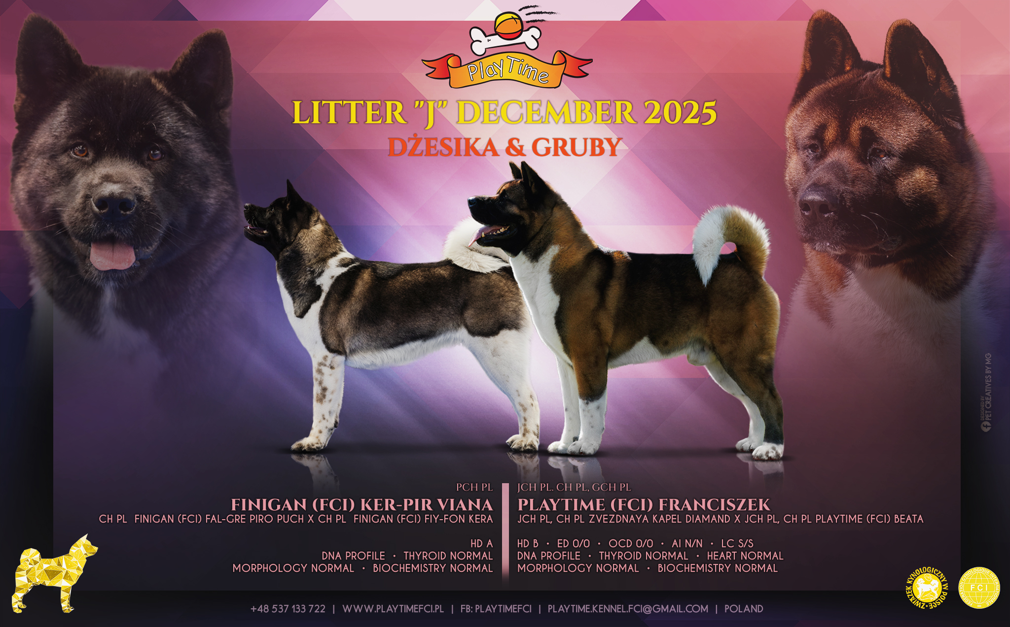 Miło nam poinformować, że w hodowli PlayTime FCI prowadzonej przez osobę z 10-letnim stażem w rasie Akita Amerykańska, która jest także behawiorystą psów i trenerem psów planujemy miot „K” na przełomie jesień/zima 2026 roku. Szczenięta będą do odbioru po ukończeniu 12 tygodnia życia.
